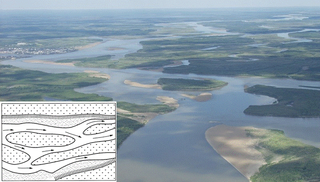 Многорукавность как тип руслового процесса подразделяется на русловую и пойменную. Русловая многорукавность возникает при большом количестве влекомых наносов, выносимых с вышерасположенных участков реки. Наносы аккумулируются в русле, образуя в межень острова и осерёдки (рис. 2.22).