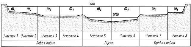 Для нахождения расходов ежегодно проходящих во время половодья через створ проектируемого мостового перехода необходимо знать: V – скорость протекания воды; w – площадь, через которую вода протекает. В связи с тем, что на разных участках поперечного сечения водотока условия протекания могут быть различными, поперечное сечение водотока делится на участки (рис. 5.1).