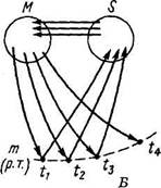Вообще сигналы обратной связи от движений часто залараллелены, т.е. они поступают одновременно по нескольким каналам. Например, когда человек идет, то ощущает свои шаги с помощью мышечного чувства и одновременно может их видеть и слышать. Так же и в обсуждаемом случае: воспринимая проприоцептивные сигналы от своих речевых движений, человек одновременно отчетливо слышит звуки своей речи. Я сейчас докажу, что и те и другие сигналы используются для организации речевых движений. Современная лабораторная техника позволяет поставить человека в совершенно необычные условия. Испытуемому предлагают произносить какой-нибудь текст, например, знакомое стихотворение. Этот текст через микрофон подают ему в наушники, но с некоторым запаздыванием; таким образом, испытуемый слышит то, что он говорил несколько секунд назад, а то, что говорит в данный момент, он не слышит. Оказывается, что в этих условиях речь субъекта полностью расстраивается; он оказывается неспособным вообще что-либо говорить! В чем здесь дело? Нельзя сказать, что в описанных опытах испытуемый лишен сигналов обратной связи: оба чувствительных канала — мышечный и слуховой — функционируют. Дело все в том, что по ним поступает несогласованная, противоречивая информация. Так что на основании одной информации следовало бы производить одно речевое движение, а на основании другой — другое движение. В результате испытуемый не может произвести никакого движения. Замечу, что описанный прием «сшибки» сигналов обратной связи используют для выявления лиц, симулирующих глухоту: если человек действительно не слышит, то задержка сигналов обратной связи по слуховому каналу не вызывает у него никакого расстройства речи; если же он только притворяется неслышащим, то этот прием действует безотказно. Перейдем к следующему важному пункту теории Н.А.Бернштейна — к схеме рефлекторного кольца. Эта схема непосредственно вытекает из принципа сенсорных коррекций и служит его дальнейшим развитием. Рассмотрим сначала упрощенный вариант этой схемы (см. рис. 1, А). Имеется моторный центр (М), из которого поступают эффекторные команды в мышцу. Изобразим ее блоком внизу, имея в виду также рабочую точку движущегося органа (т). От рабочей точки идут сигналы обратной связи в сенсорный центр (S); это чувствительные, или афферентные, сигналы. В ЦНС происходит переработка поступившей информации, т.е. перешифровка ее на моторные сигналы коррекции. Эти сигналы снова поступают в мышцу. Получается кольцевой процесс управления. Гиппенрейтер Ю.Б. Физиология движений и физиология активности