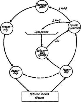 Рис. 2. Схема рефлекторного кольца Н.А.Бернштейна мент отрабатывается какой-то ее частный этап, или элемент, и соответствующая частная программа спускается в задающий прибор. Из задающего прибора сигналы поступают на прибор сличения; Н.А.Бернштейн обозначает их двумя латинскими буквами SW (от нем. Soil Wert, что означает «то, что должно быть»). На тот же блок от рецептора приходят сигналы обратной связи, сообщающие о состоянии рабочей точки; они обозначены IW (от нем. 1st Wert, что означает «то, что есть»). В приборе сличения эти сигналы сравниваются, и на выходе из него получаются AW, т.е. сигналы рассогласования между требуемым и фактическим положением вещей. Они попадают на блок перешифровки, откуда выходят сигналы коррекции; через промежуточные центральные инстанции (регулятор) они попадают на эффектор. Разберем функционирование кольца управления на примере какого-нибудь реального движения. Предположим, гимнаст работает на кольцах. Вся комбинация целиком содержится в его двигательной программе. В соответствии с програм- Гиппенрейтер Ю.Б. Физиология движений и физиология активности 523