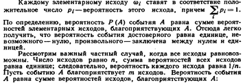 Получено классическое определение вероятности. Замечание 2. Построение логически полноценной теории вероятностей основано на аксиоматическом определении случайного события и его вероятности. В системе аксиом, предложенной А. Н. Колмогоровым, неопределяемыми понятиями являются элементарное событие и вероятность. Приведем аксиомы, определяющие вероятность: 1. Каждому событию А поставлено в соответствие неотрицательное действительное число Р (А). Это число называется вероятностью события А. 2. Вероятность достоверного события равна единице: