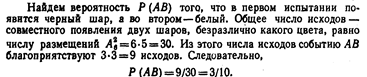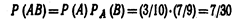 порядок, в котором расположены события, может быть выбран любым, т.е. безразлично какое событие считать первым, вторым и т. д. Пример 1. У сборщика имеется 3 конусных и 7 эллиптических валиков. Сборщик взял один валик, а затем второй. Найти вероятность того, что первый из взятых валиков—конусный, а второй — эллиптический.Решение. Вероятность того, что первый валик окажется конусным событие А), Вероятность того, что второй валик окажется эллиптическим (событие в),