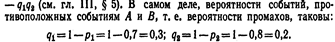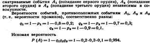Событие А произойдет, если наступит одно из двух несовместных событий: А B¯ или А В. По теореме сложения вероятностей несовместных событий имеем Замечание 2. Если события А и В несовместны, то их сов- Мы вновь получили теорему сложения для несовместных событий. Таким образом, формула (****) справедлива как для совместных, так и для несовместных событий. Пример 2. Вероятности попадания в цель при стрельбе первого Искомая вероятность