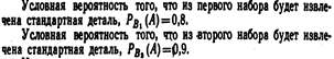 получим формулу полной вероятности Пример 1. Имеется два набора деталей. Вероятность того, что деталь первого набора стандартна, равна 0, 8, а второго—0, 9. Найти вероятность того, что взятая наудачу деталь (из наудачу взятого набора)—стандартная.Решение. Обозначим через А событие «извлеченная деталь стандартна».Деталь может быть извлечена, либо из первого набора (событие В1), либо из второго (событие В2).Вероятность того. что деталь вынута из первого набора.Р(В1)=1/2. Вероятность того, что деталь вынута из второго набора.Р(В2)=1/2.