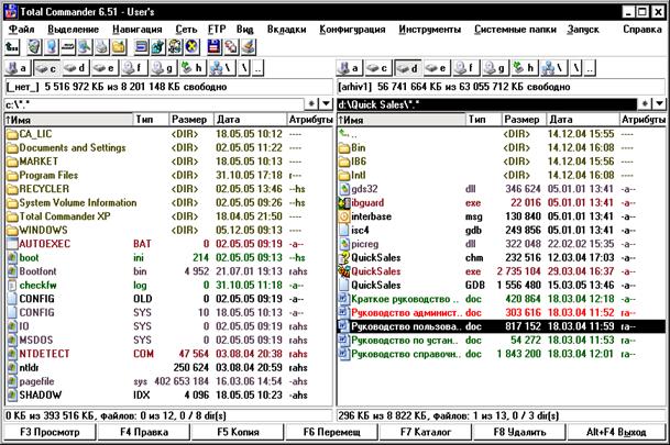 Запуск программы-оболочки Total Commander осуществляется из главного меню операционной системы Windows с помощью команды Пуск / Программы / Total Commander/ Total Commander либо с помощью ярлыка на Рабочем столе или на Панели задач. Интерфейс программы Total Commander состоит из строки меню, панелей инструментов, двух прямоугольных окон – панелей (рис. 5.1). Под панелями располагается строка с приглашением к работе в операционной системе