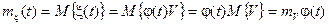 Пример 1.6. Пусть случайный процесс x(t)=j(t)V, tÎ T, где V – некоторая случайная величина, с математическим ожиданием mV и дисперсией DV, а j(t) – неслучайная функция. Найти математическое ожидание mx(t), дисперсию Dx(t) и функцию корреляции случайного процесса Rx(t1, t2). Решение. Согласно определениям имеем