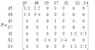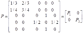 Очевидно, что у рассматриваемой цепи все состояния существенные и есть два неразложимых класса X1={1, 2}, X2={3, 4, 5}, и исследование ее свойств сводится к исследованию свойств каждой из двух цепей с матрицами вероятностей переходов соответственно P 1 и P 2. Проведенная классификация позволяет привести матрицу вероятностей переходов к каноническому виду. Для этого выделяют неразложимые классы, а также отдельно несущественные состояния. Тогда матрица P примет вид