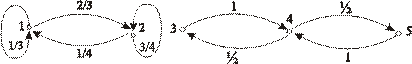 Рис. 1. Как видно из рисунка, {1, 2, 3} – несущественные состояния, {4, 5, 6} – существенные. Рассмотрим множество существенных состояний. Определение. Состояние j называется достижимым из состояния i (обозначается i®j), если $ n> 0, что pij(n )> 0. Определение. Состояния i и j называются сообщающимися (обозначается i «j), если j достижимо из i, и i достижимо из j. По определению отношение ««» является симметричным (i «j Þ j «i), и нетрудно убедиться, что оно транзитивно (i «j, j «k Þ i «j). Множество существенных состояний можно разбить на конечное или счетное число непересекающихся множеств X1, X2, …, состоящих из сообщающихся состояний и характеризующихся тем, что переходы между различными множествами невозможны. Определение. Множества X1, X2, … называются замкнутыми классами, или неразложимыми классами, существенных сообщающихся состояний. Цепь Маркова, состояния которой образуют один неразложимый класс, называется неразложимой. Пример 2.2. Классифицировать состояния цепи Маркова с множеством состояний X={1, 2, 3, 4, 5} и матрицей вероятностей переходов
