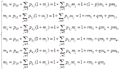 Среднее время перехода из состояния в состояние внутри замкнутого класса Рассмотрим некоторый замкнутый класс S. Обозначим mij – среднее значение времени перехода из состояния i в состояние j внутри замкнутого класса для " i, j Î S. Тогда можно получить систему линейных неоднородных алгебраических уравнений, определяющих значения mij: