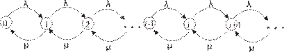 Если в момент появления заявки на входе СМО хотя бы один канал свободен от обслуживания, её обслуживание может быть начато немедленно, без задержки. Однако вполне вероятна ситуация, когда заявка застает СМО полностью загруженной, то есть когда все m каналов обслуживания заняты обслуживанием. В этом случае начало обслуживания задерживается, заявка может занять место в соответствующей очереди. Таким образом, вторым важным компонентом структуры СМО является очередь, параметром которой является число мест в очереди n. В приоритетных системах общая очередь может быть разделена на несколько очередей по числу различаемых системой приоритетов, для каждой из которых должно быть указано число мест ni i =1, 2, …, N. На число мест в очереди может быть наложено ограничение, это может быть сделано как для каждой очереди в отдельности, так и для всей совокупности очередей в целом. При этом возможны конфликтные ситуации, решением которых может быть отказ системы принять заявку. В зависимости от числа мест в очереди различают СМО с отказами и, соответственно, СМО без отказов. В СМО с отказами число мест в очереди конечно, и вследствие вероятного характера как входящего потока, так и процессов обслуживания, существует ненулевая вероятность того, что поступившая на вход СМО заявка застанет все каналы занятыми обслуживанием и все места в очереди занятыми ожидающими обслуживания заявками, то есть она получит отказ. В СМО без отказов заявка либо сразу назначается на обслуживание, если в момент ее поступления свободен хотя бы один канал обслуживания, либо безусловно принимается в очередь на обслуживание. Для описания СМО используется символика Кендалла в виде A | B | N1 | N2 | f. Здесь первый символ означает входящий поток заявок. Наиболее часто встречаются следующие символы: М – простейший поток заявок с постоянной интенсивностью; М (t) – пуассоновский с Ek – эрланговский поток k -го порядка; GI – рекуррентный поток; G – поток с зависимыми интервалами. Если потоков n, то индексом указывается число потоков и вверху ставится стрелка; например, Второй символ – распределение времени обслуживания: M – экспоненциальное распределение; Ek – эрланговское порядка k; G – распределение времени обслуживания произвольное. Если время обслуживания разное для разных типов заявок, то над соответствующим символом ставится стрелка. N 1 – число обслуживающих приборов; N 2 – число мест для ожидания. Что касается дисциплины обслуживания, то мы рассмотрим лишь те дисциплины, которые встречаются в СМО с одним входящим потоком. Наиболее часто используются: FIFO – «first input – first output» – дисциплина «первым пришел – первым обслужен»; LIFO – «last input – first output» – дисциплина «последний пришел – первый обслужен». Систему массового обслуживания будем называть марковской, если процесс изменения ее состояний является цепью Маркова с непрерывным временем. Удобным способом задания марковских СМО являются графы вероятностей переходов состояний таких систем. Для марковских СМО графы вероятностей переходов строятся совершенно аналогично построению таких графов для цепей Маркова с непрерывным временем. Вершина графа обозначает состояние системы. Ребра графа ориентированы и показывают возможные переходы из одного состояния в другое. В графе рисуют лишь те ребра, которые показывают переходы с н