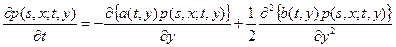 для переходной плотности распределения. Прямое уравнение Колмогорова. Уравнение Фоккера-Планка Теперь получим прямое уравнение Колмогорова, которое является сопряжённым к обратному и ещё называется уравнением Фоккера-Планка. Для вывода этого уравнения необходимо существование переходной плотности распределения, так как прямое уравнение составлено именно для переходной плотности распределения p (s, x; t, y). Теорема. Если для переходной плотности распределения p (s, x; t, y) существуют производная по t, а также первая и вторая производные по y, то для любых y и всех t > s переходная плотность распределения p (s, x; t, y) удовлетворяет уравнению