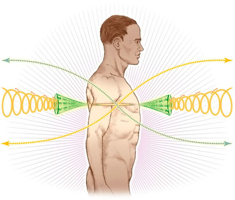 Каждая чакра по-своему влияет на тело в физической, эмоциональной, умственной и духовной сфере. Это происходит потому, что каждый энергетический орган вибрирует на своей собственной частоте и вращается с определенной скоростью. Вспомните определение энергии, которое мы сформулировали: движущаяся информация. Поэтому информация обладает скоростью и частотой. Разнообразные скорости и частоты изменяют информацию в любом, даже минимальном, количестве энергии. Если скорость данных выше скорости света, они считаются тонкой энергией и могут преобразовываться чакрами. Информация, движущаяся со скоростью света или меньшей, воспринимается чакрами как сенсорная и влияет на физическую реальность. Чакры могут получать и преобразовывать оба типа энергии, превращая ее в полезную для человека информацию. Чакра создает вибрацию, идущую из физического тела наружу, и излучает информацию через кожу. Она также получает сообщения извне, преобразуя их для восприятия. Этот входящий и выходящий поток энергии означает, что чакры в де йствительности выглядят скорее как полосы непрекращающейся энергии, а не как конические завихрения, в виде которых их часто представляют. Не только энергия чакр течет как бесконечная река, этот энергетический поток привлекает другие энергии Вселенной. Некоторые из них взаимодействуют и образуют мини-вселенную человека, куда входит поле ауры – окружающие человека слои энергии, и другие энергетические каналы, тела и поля, протекающие внутри и снаружи нашего «я» (среди них нади, а также дополнительные энергетические тела – причинное и эмоциональное). Каждая чакра вибрирует на своей частоте. Чем ниже она расположена в теле, тем ниже частота, чем выше – тем выше частота вибрации. Люди, настроенные на эти частоты, видят их как цвет или свет. Расположенные внутри тела чакры находятся в спектре видимого света; нижняя чакра затрагивает инфракрасный участок цветового спектра, а выше расположенные чакры – ультрафиолетовый. Чем ниже по отношению к телу расположена чакра, тем она ближе к инфракрасному спектру. Чем выше чакра в теле, тем больше она простирается в ультрафиолетовые частоты. Красный – это первый видимый цвет, воспринимаемый нами. Он соответствует первой чакре, расположенной в промежности. Фиолетовый – это последний цвет, который мы можем увидеть, прежде чем перейдем к ультрафиолетовым частотам, и этот цвет соответствует шестой чакре во лбу. Изображение цветового спектра чакр (рис. 5.3) наводит на мысли о видимости чакр. Один из главных вопросов таков: если чакры присутствуют и вибрируют на частотах этих цветов, почему мы не способны воспринять цвет на физическом уровне? Волны нашего мозга колеблются в интервале от 0 до 100 Гц. (Смотри ниже исследование Валери Хант в разделе «Научные исследования»). Чакры вибрируют в промежутке от 100 до 1 600 Гц, но наш мозг просто не способен воспринимать такие высокие частоты. Тем не менее в течение веков обладающие интуицией люди могли различа ть шесть и даже семь чакр. Главные шесть (от первой до шестой чакры) имеют частоту физически видимого спектра (красный, оранжевый, желтый, зеленый, голубой, фиолетовый). Интуиция часто различает только то, что позволяет различить мозг. Если мозг говорит: «Я не могу видеть инфракрасный или ультрафиолетовый», то наша интуиция не будет различать