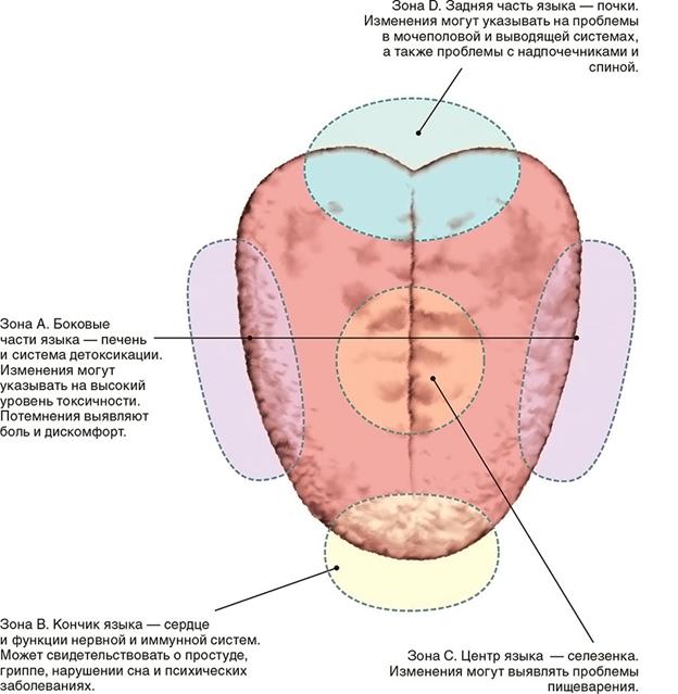 Одной из самых распространенных процедур тестирования на Востоке является определение пульса и слабых или сильных мест на ухе. Зная, какие точки уха связаны с определенными органами или зонами тела, практик может поставить диагноз, а затем стимулировать определенную зону иглоукалыванием, массажем и другими формами воздействия. Существует несколько теорий, объясняющих этот процесс. Доктор Вильям Тиллер описывает эти понятия в своей книге «Наука и человеческая трансформация». Как объясняет Тиллер, одним из открытий Ножье было определение места автономного сосудистого сигнала, описывающего систему, которая управляет гладкими мышцами в стенках артерий и тонкого кишечника. Ножье задокументировал изменения в симпатическом и парасимпатическом состоянии автономной нервной системы, отмечая изменения в пульсе радиальной артерии на запястье. Он назвал это аурикулярно-серде чным рефлексом. Позднее исследователь Джулиан Кеньон использовал аурикулярно-сердечный рефлекс для определения того, какую пищу и химикаты человек может переносить. Тестирование может быть простым, когда вещество находится рядом с ухом пациента и постоянно определяется пульс на радиальной артерии. Положительная реакция, которая обозначает переносимость, отмечается незначительным повышением радиального пульса. Негативная реакция обозначает, что вещество вредно, и пульс понижается. Диагностика состояния языка Язык считается важным органом диагностики, так как он изобилует сосудами, в нем происходит постоянный приток жидкости, он содержит вкусовые рецепторы и поддерживается нервной и кровеносной системами. Он также производит слюну, которая содержит воду, электролиты, слизь и энзимы. Слюнные химические вещества могут изменять внешний вид языка в соответствии с дисбалансом органов. Эти уникальные качества языка способствуют поста новке точного диагноза (рис. 6.31). Во время осмотра языка практик принимает во внимание такие факторы, как налет, форма и цвет языка. Если в определенной зоне есть какая-либо аномалия, практик обращает особое внимание на соответствующие системы органов. Цвет языка Нормальный цвет языка – розовокрасный. Цвет часто связан с функционированием внутренних органов и состоянием крови, а также с иммунитетом. Практик часто ищет бледные, красные или фиолетовые тени. Каждая имеет особое значение, особенно оттенок налета. Например, бледный язык выявляет чрезмерный холод, если имеется плотный белый налет. Это может быть признак анемии или ослабления тела. Красный язык может указывать на дефицит инь, если налет тонкий, отсутствует или отшелушивается. Форма языка Нормальный язык – гладкий, без трещин, не слишком толстый и не слишком тонкий. При оценке формы языка практик может рассматривать следы от зубов, язвы и воспаления. Эти признаки могут указывать на отек или опухоль в теле, а также на нервозность. Форма языка часто указывает на состояние жидкостей тела и потока ци. Например, выпуклый или отекший язык указывает на дефицит ци селезенки и влажный жар, а удлиненный язык может указывать на сердечный жар. Налет на языке У здорового человека налет на языке тонкий и чистый или иногда бледно-желтый и слегка утолщающийся к задней части языка. Толстый налет обычно отражает проблемы пищеварительной системы. Налеты другого цвета указываю