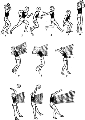 Нападающий удар—это, пожалуй, самое привлекательное в технике игры в волейбол. Как бы ни устал игрок на тренировке, но, когда выдается свободная минута, он всегда спешит к сетке—выполнить нападающий удар. Нападающий удар вызывает восторг зрителей и доставляет огромное удовольствие самим волейболистам. Прямой нападающий удар. Основной способ нападающего удара-—прямой нападающий удар «по ходу», когда направление полета мяча совпадает с направлением разбега игрока перед прыжком. На рис. 8 показаны основные положения волейболиста при выполнении прямого нападающего удара. В последнем шаге разбега правая нога выставляется вперед с опорой на пятку, одновременно с этим руки отводятся для замаха назад. Затем игрок приставляет левую ногу и, делая маховые движения руками, производит отталкивание. При замахе игрок прогибается в пояснице, рука, согнутая в локте, отводится назад, за голову, после чего туловище выпрямляется, рука приближается к мячу, при этом движении предплечье и кисть отстают. В момент удара рука выпрямляется, игрок сгибается в пояснице. После удара рука продолжает движение вниз, и игрок приземляется. Чем ближе к сетке передача и выше прыжок, тем энергичнее заключительное движение кистью руки при ударе по мячу. При ударе с далеких от сетки передач заключительное движение кистью выражено слабее, зато характерна активная работа туловища. Самое сложное в этом техническом приеме состоит в том, что игрок должен очень точно рассчитать свои действия в соответствии с высотой и направлением полета мяча и произвести удар по мячу в высшей точке прыжка. Большинство ошибок при изучении нападающего удара происходит от неумения занимающихся своевременно выйти на мяч: прыгает слишком рано или запаздывает с прыжком, в результате неточно рассчитанного прыжка для удара мяч оказывается сзади игрока, далеко впереди или в стороне от него. Такие недостатки затрудняют овладение занимающимися правильным движением при ударе по мячу и надолго затягивают процесс формирования двигательного навыка нападающего удара. Вот почему при обучении нападающему удару так велика