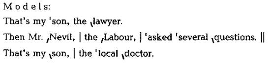 — Good afternoon, Mrs. White, how are you? — Very well indeed, thank you, and how are you? — Quite well, thank you. Won't you sit down. Excuse me, please. I think that's my niece at the door. — Hello, Betty dear! I'm so glad to see you. You do look well. I don't think you've met each other before. Let me introduce you. This is my niece, Miss Smith. Mr. White, Mrs. White. — How do you do? — How do you do? — And now let's have some tea. How do you like your tea, Mrs. White, strong or weak? — Not too strong, please and one lump of sugar. I like my tea rather sweet, but my husband prefers his without sugar. — Well, what's the news, Mr. White? How's business? — Pretty good, thank you. And how are things with you? — Well, not too good, I'm afraid, and going from bad to worse. In fact, it's the worst year we've had for a long time. — I'm sorry to hear that. I hope things will soon improve. — Yes. Let's hope for the best. Exercise IV. Listen to these jokes. Mark the stresses and tunes. Dramatize the jokes. 1. — Johnny, here's a good piece of bread and butter. — Thank you, aunty. — That's good, Johnny. I like to hear little boys say " thank you", dear. — Oh, aunty, if you want to hear me say it again, then put some jam on that piece of bread. 2. — Grandpa, would you like me to give you a new pipe for your birthday? — That's very nice of you, Mary, but I've got a pipe. — Don't think you have. Grandpa. I've just broken it. 3. — Darling, will you many me? — No, dear, but I will always admire your good taste. 4. — I love you, I love you, darling. — You must see mama first, Joe. — I've seen her several times, dear, but I love you just the same. UNIT 17. INTONATION OF APPOSITION