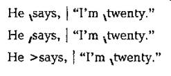 Предложение, вводящее прямую речь, выделяется в отдельную синтагму и произносится либо восходящим, либо нисходящим тоном, либо на среднем уровне (Midlevel). Например: