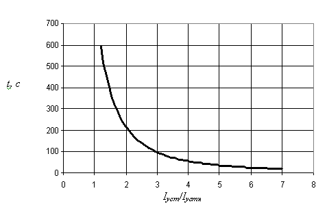 Рис. 1. Характеристика теплового реле На рисунке 1 приведен пример характеристики реле в холодном состоянии, где Iустн – номинальный ток уставки, а Iуст – ток, который протекает через реле в определенный момент времени. Под номинальным током уставки понимается наибольший ток, который в течение длительного времени при данной настройке реле не приводит к его срабатыванию. Тепловые реле надежно защищают электродвигатель от перегрузок только в случае его эксплуатации в режиме S1 (продолжительный режим работы). Температурные условия мест, в которых установлены реле и защищаемый двигатель должны быть полностью идентичны. Если двигатель работает в повторно-кратковременном режиме, то защита его от перегрузок тепловым реле неэффективна, кроме того, возможны ложные срабатывания. В случае, когда величины токов электродвигателя имеют относительно большие значения, тепловое реле может включаться через трансформаторы тока. Тепловое реле необходимо выбрать таким образом, чтобы его номинальные значения напряжения и тока соответствовали аналогичным значениям двигателя, далее необходимо выставить ток уставки согласно следующим выражениям: Iустн = Iдн, если Тср = Тн, где Iдн – номинальное значение линейного тока двигателя, Тср – температура окружающей среды, в которой установлено тепловое реле, Тн – температура калибровки реле;