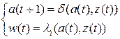 Выходные сигналы автомата Мили - сигналы первого рода. Память автомата характеризуется множеством внутренних состояний автомата. Указывается (обязательно) состояние с которого автомат начинает работу - начальное состояние. Алгоритм работы задается функцией переходов и функцией выходов первого рода: