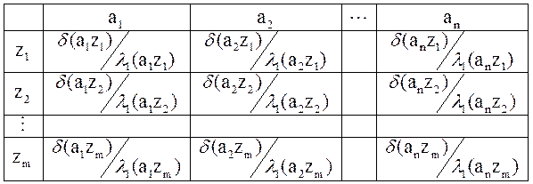 Табличное задание автомата Мили При табличном способе задания в верхней строке перечисляются все состояния конечного автомата, а в левом столбце – все входные сигналы. В верхних треугольниках пишут состояние в которое должен переключиться автомат в соответствии с заданным алгоритмом функционирования, в нижних треугольниках записывают значения выходных сигналов 1 рода.