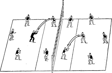«Два мяча через сетку». Мяч вводится в игру нижней подачей. В случае потери подачи игра продолжается по правилам «Пионербола», но команде, допустившей потерю подачи, выигрыш очка не засчитывается. Учебная игра в волейбол по упрощенным правилам— ошибки при приеме мяча не фиксируются, мяч вводится в игру передачей из зоны 6. Заключительная часть — 5 мин. УРОК 6 Задачи урока: 1. Обучение верхней передаче после перемещений. 2. Обучение нижней прямой подаче. 3. Изучение тактики первых и вторых передач. Продолжительность урока—120 мин. Инвентарь—набивные, баскетбольные, волейбольные мячи. Подготовительная часть — 25 мин. 1. Упражнение 15 из урока 2 на быстроту перемещения. 2. Многократные передачи баскетбольного (футбольного) мяча о стену и ловля. Броски набивного мяча от лица двумя руками (из стойки волейболиста) на дальность. Упражнения можно проводить в виде соревнования. 4. Упор лежа. Передвижение на руках вправо (влево) по кругу, носки ног на месте. То же, но передвижение вправо и влево, одновременно выполняя «приставные шаги» руками и ногами. В упоре лежа сгибание и разгибание рук (ладони обращены пальцами вперед, внутрь, наружу), то же, но с опорой рук на пальцы. 6. Из стойки на коленях, руки в стороны, падение вперед в упор лежа на согнутых руках и возвращение в исходное положение толчком рук. 7. Из исходного положения правая нога назад взмах правой ногой вперед с одновременным поворотом налево кругом; то же левой ногой с поворотом направо (несколько раз подряд в каждую сторону). Из исходного положения лежа на груди, разгибая