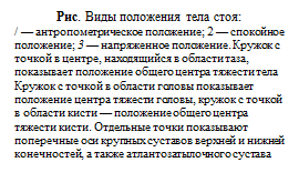 Работа двигательного аппарата в каждом виде и положении тела стоя зависит от того, как проходит вертикаль о.ц.т. тела по отношению к осям вращения в отдельных суставах. Поскольку тяжесть тела при симметричном стоянии распределена равномерно на правую и левую половины тела и перемещение вертикали о.ц.т. тела происходит в основном в передне-заднем направлении, наибольшее участие в удержании тела в равновесии принимают мышцы, расположенные спереди и сзади поперечной оси суставов, т.е. сгибатели и разгибатели. Антропометрическое положение является исходным при измерениях длины тела, длины его отдельных звеньев, при изучении строения тела (в анатомии). В антропометрическом положении тело несколько отклонено назад и соприкасается с ростомером (отвесом или стеной) областью затылка, лопаток, ягодиц и пяток. Несомненно, это положение вынужденное, малоудобное и утомительное.