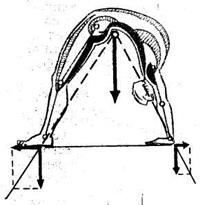 Тело человека при данном положении сильно изогнуто, своими отдельными частями оно образует свод с различными радиусами кривизны, более крутой или более пологий. Опора происходит на дистальные звенья конечностей – кисть и стопу. Из внешних сил на тело действуют не только сила тяжести и вертикальная составляющая реакции опоры, но также сила трения, от величины которой зависит как характер работы двигательного аппарата (в частности, степень напряжения мышц), так и характер выполнения самого упражнения. Из внутренних сил, способствующих сохранению равновесия тела в данном положении, определенное значение имеет сила эластической тяги, возникающая при растягивании мышц, связок, суставной сумки хрящей и т.п. О.ц.т. тела расположен вне тела, несколько ниже поясничного отдела позвоночного столба. Площадью опоры в положении «мост» являются: площадь соприкосновения с опорной поверхностью подошвенной стороны стоп, ладонной поверхности кистей и площадь пространства, заключенного между ними. Поскольку о.ц.т. тела расположен выше площади опоры, данное положение относится к виду неустойчивого равновесия, причем степень устойчивости тела в передне-заднем направлении (по длине тела) больше, чем в поперечном, так как передний и задний углы устойчивы по величине значительно превышают боковые. Работа двигательного аппарата в положении «мост» довольно сложная, своеобразная и во многом определяется положением отдельных звеньев тела и действием силы тяжести или силы трения. Если говорить о состоянии пассивного двигательного аппарата, то следует отметить, что стопа находится в положении сгибания, особенно если опора происходит не на всю подошвенную поверхность ее, а на передний край. Продольные оси голени и бедра образуют угол, открытый назад, т.е. в коленном суставе имеет место сгибание бедра по отношению к закрепленной голени, сила тяжести стремится уменьшить этот угол, или другими словами, увеличить сгибание. Для этого положения характерно разгибание в тазо-бедренном суставе, как и в области позвоночного столба. При разгибании позвоночного столба происходит увеличение шейного и поясничного лордозов и уменьшение грудного кифоза, в связи с чем верхний отдел (передняя часть) межпозвоночных дисков и передняя продольная связка позвоночника испытывают растягивание, а нижний отдел (задняя часть) их, а также задняя продольная связка – сжатие. Величина разгибания позвоночного столба зависит от ряда факторов: эластичности его связочного аппарата, высоты межпозвоночных дисков (чем они толще, тем больше подвижность между позвонками), степени выраженности остистых отростков (сильно развитые остистые отростки в нижнем грудном и поясничном отделах позвоночного столба при разгибании, упираясь друг в друга, могут препятствовать ему), длины позвоночного столба (чем он длиннее, тем лучше выражена гибкость). У женщин гибкость больше, чем у мужчин, у детей больше, чем у людей пожилого возраста. Подвижность в тазобедренных суставах, особенно разгибание, также способствует увеличению изгиба тела в положении мост. Немаловажное значение имеет и степень развития данного физического качества. В положении «мост» кости пояса верхней конечности расположены так, что наружный конец ключицы приподнят, лопатка не только смещена к головному концу тела, но ее 
