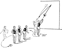2. Эстафета у стены с поворотами. Игроки располагаются в колонны по одному у стены. По сигналу первые игроки делают передачу над собой, затем о стену, поворачиваются на 360°, принимают мяч и, направив его в