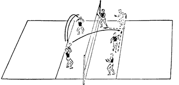 Рис. 82. Нападающий удар с длинной передачи Нападающий удар из зоны 4, вторая передача из зоны 2 (удар с длинной передачи). Передачу вначале выполняет инструктор или кто-нибудь из занимающихся, хорошо владеющий навыками второй передачи (рис. 82)