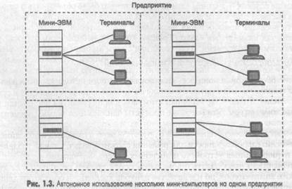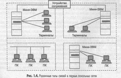 Но шло время, потребности пользователей вычислительной техники росли, им стало недостаточно собственных компьютеров, им уже хотелось получить возможность обмена данными с другими близко расположенными компьютерами. В ответ ____________________________________ 1.1. От централизовонных систем - к вычислительным сетям 25 на эту потребность предприятия и организации стали соединять свои мини-компьютеры вместе и разрабатывать программное обеспечение, необходимое для их взаимодействия. В результате появились первые локальные вычислительные сети (рис. 1.4). Они еще во многом отличались от современных локальных сетей, в первую очередь — своими устройствами сопряжения. На первых порах для соединения компьютеров друг с другом использовались самые разнообразные нестандартные устройства со своим способом представления данных на линиях связи, своими типами кабелей и т. п. Эти устройства могли соединять только те типы компьютеров, для которых были разработаны, — например, мини-компьютеры PDP-11 с мэйнфреймом IBM 360 или компьютеры «Наири» с компьютерами «Днепр». Такая ситуация создала большой простор для творчества студентов — названия многих курсовых и дипломных проектов начинались тогда со слов «Устройство сопряжения...».