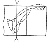 2. Игроки располагаются, как показано на рис. 100. В зоне 3 игрок подбрасывает мяч над собой и в прыжке направляет его двумя руками сверху к боковой линии между зонами 1 и 2. Игрок выходит и принимает мяч сверху двумя руками с последующим падением и направляет его в зону 3. В зоне 3 игрок передачей назад посылает мяч через сетку в зону 2. 3. Прием мяча в зону 2 снизу одной рукой с последующим падением у сетки—мяч обманной передачей направляется из зоны 2. II. Совершенствование навыка нападающих ударов — 30 мин. 1. Три игрока располагаются в зонах 5, 6 и 1. Передачи в тройках в движении к сетке и нападающий удар (рис. 101); А) из зоны 5 передача в зону 6, из зоны 6 назад в зону 1, из зоны 1 в зону 4, из зоны 4 в зону 3 к сетке, из зоны 3 в зону 4 и завершающий нападающий удар;