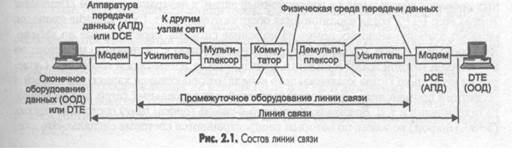 2.1.1. Типы линий связи Линия связи (рис. 2.1) состоит в общем случае из физической среды, по которой передаются электрические информационные сигналы, аппаратуры передачи данных и промежуточной аппаратуры. Синонимом термина линия связи (line) является термин канал связи (channel).