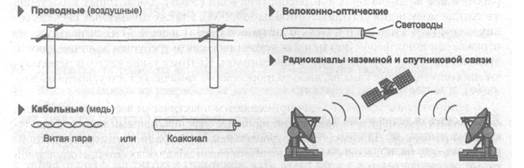 Рис. 2.2. Т ипы линии связи Проводные (воздушные) линии связи представляют собой провода без каких-либо изолирующих или экранирующих оплеток, проложенные между столбами и висящие в воздухе. По таким линиям связи традиционно передаются телефонные или телеграфные сигналы, но при отсутствии других возможностей эти линии используются и для передачи компьютерных данных. Скоростные качества и помехозащищенность этих линий оставляют желать много лучшего. Сегодня проводные линии связи быстро вытесняются кабельными. Кабельные линии представляют собой достаточно сложную конструкцию. Кабель состоит из проводников, заключенных в несколько слоев изоляции: электрической, электромагнитной, механической, а также, возможно, климатической. Кроме того, кабель может быть оснащен разъемами, позволяющими быстро выполнять присоединение к нему различного оборудования. В компьютерных сетях применяются три основных типа кабеля: кабели на основе скрученных пар медных проводов, коаксиальные кабели с медной жилой, а также волоконно-оптические кабели. Скрученная пара проводов называется витой парой (twisted pair). Витая пара существует в экранированном варианте (Shielded Twistedpair, STP), когда пара медных проводов обертывается в изоляционный экран, и неэкранированном (Unshielded Twistedpair, UTP), когда изоляционная обертка отсутствует. Скручивание проводов снижает влияние внешних помех на полезные сигналы, передаваемые по кабелю. Коаксиальный кабель (coaxial) имеет несимметричную конструкцию и состоит из внутренней медной жилы и оплетки, отделенной от жилы слоем изоляции. Существует несколько типов коаксиального кабеля, отличающихся характеристиками и областями применения — для локальных сетей, для глобальных сетей, для кабельного телевидения и т. п. Волоконно-оптический кабель (opticalfiber) состоит из тонких (5-60 микрон) волокон, по которым распространяются световые сигналы. Это наи- 2.1. Линии связи 111 более качественный тип кабеля — он обеспечивает передачу данных с очень высокой скоростью (до 10 Гбит/с и выше) и к тому же лучше других типов передающей среды обеспечивает защиту данных от внешних помех. Радиоканалы наземной и спутниковой связи образуются с помощью передатчика и приемника радиоволн. Существует большое количество различных типов радиоканалов, отличающихся как используемым частотным диапазоном, так и дальностью канала. Диапазоны коротких, средних и длинных волн (KB, CB и ДВ), называемые также диапазонами амплитудной модуляции (Amplitude Modulation, AM) по типу используемого в них метода модуляции сигнала, обеспечивают дальнюю связь, но при невысокой скорости передачи данных. Более скоростными являются каналы, работающие на диапазонах ультракоротких волн (УКВ), для которых характерна частотная модуляция (Frequency Modulation, FM), а также диапазонах сверхвысоких частот (СВЧ или microwaves). В диапазоне СВЧ (свыше 4 ГГц) сигналы уже не отражаются ионосферой Земли и для устойчивой связи требуется наличие прямой видимости между передатчиком и приемником. Поэтому такие частоты используют либо спутниковые каналы, либо радиорелейные каналы, где это условие выполняется. В компьютерных сетях сегодня применяются практически все описанные типы физических сред передачи данных, но наиболее перспективными являются волоконно-оптические. На них сегодня строятся как магистрали крупных территориаль