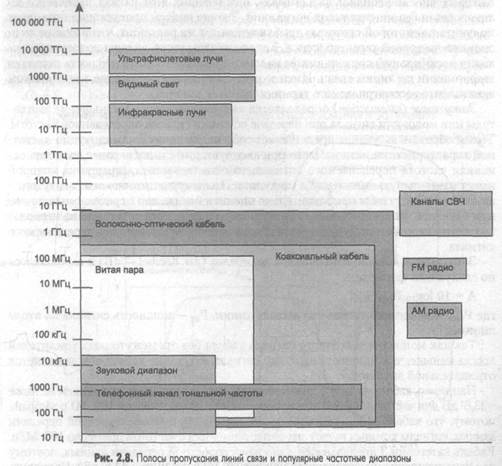 Знание амплитудно-частотной характеристики реальной линии позволяет определить форму выходного сигнала практически для любого входного сигнала. Для этого необходимо найти спектр входного сигнала, преобразовать амплитуду составляющих его гармоник в соответствии с амплитудно-частотной характеристикой, а затем найти форму выходного сигнала, сложив преобразованные гармоники. Несмотря на полноту информации, предоставляемой амплитудно-частотной характеристикой о линии связи, ее использование осложняется тем обстоятельством, что получить ее весьма трудно. Ведь для этого нужно провести тестирование линии эталонными синусоидами по всему диапазону частот от нуля до некоторого максимального значения, которое может встретиться во входных сигналах. Причем менять частоту входных синусоид нужно с небольшим шагом, а значит, количество экспериментов должно быть очень большим. Поэтому на практике вместо амплитудно-частотной характеристики применяются другие, упрощенные характеристики — полоса пропускания и затухание. 2.1. Линии связи 117 Полоса пропускания (bandwidth) — это непрерывный диапазон частот, для которого отношение амплитуды выходного сигнала ко входному превышает некоторый заранее заданный предел, обычно 0, 5. То есть полоса пропускания определяет диапазон частот синусоидального сигнала, при которых этот сигнал передается по линии связи без значительных искажений. Знание полосы пропускания позволяет получить с некоторой степенью приближения тот же результат, что и знание амплитудно-частотной характеристики. Как мы увидим ниже, ширина, полосы пропускания в наибольшей степени влияет на максимально возможную скорость передачи информации по линии связи. Именно этот факт нашел отражение в английском эквиваленте рассматриваемого термина (width — ширина). Затухание (attenuation) определяется как относительное уменьшение амплитуды или мощности сигнала при передаче по линии сигнала определенной частоты. Таким образом, затухание представляет собой одну точку из амплитудно-частотной характеристики линии. Часто при эксплуатации линии заранее известна основная частота передаваемого сигнала, то есть та частота, гармоника которой имеет наибольшую амплитуду и мощность. Поэтому достаточно знать затухание на этой частоте, чтобы приблизительно оценить искажения передаваемых по линии сигналов. Более точные оценки возможны при знании затухания на нескольких частотах, соответствующих нескольким основным гармоникам передаваемого сигнала. Затухание А обычно измеряется в децибелах (дБ, decibel — dB) и вычисляется по следующей формуле: А = 10 logio Рвых/Рвх, где Рвых — мощность сигнала на выходе линии, Рвх — мощность сигнала на входе линии. Так как мощность выходного сигнала кабеля без промежуточных усилителей всегда меньше, чем мощность входного сигнала, затухание кабеля всегда является отрицательной величиной. Например, кабель на витой паре категории 5 характеризуется затуханием не ниже -23, 6 дБ для частоты 100 МГц при длине кабеля 100 м. Частота 100 МГц выбрана потому, что кабель этой категории предназначен для высокоскоростной передачи данных, сигналы которых имеют значимые гармоники с частотой примерно 100 МГц. Кабель категории 3 предназначен для низкоскоростной передачи данных, поэтому для него определяется затухание на частоте 10 МГц (не ни