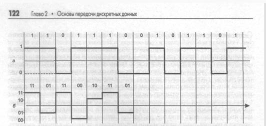 Выбор способа представления дискретной информации в виде сигналов, подаваемых на линию связи, называется физическим или линейным кодированием. От выбранного способа кодирования зависит спектр сигналов и, соответственно, пропускная способность линии. Таким образом, для одного способа кодирования линия может обладать одной пропускной способностью, а для другого — другой. Например, витая пара категории 3 может передавать данные с пропускной способностью 10 Мбит/с при способе кодирования стандарта физического уровня 10Base-T и 33 Мбит/с при способе кодирования стандарта 100Base-T4. В примере, приведенном на рис. 2.9, принят следующий способ кодирования — логическая 1 представлена на линии положительным потенциалом, а логический 0 — отрицательным. Теория информации говорит, что любое различимое и непредсказуемое изменение принимаемого сигнала несет в себе информацию. В соответствии с этим прием синусоиды, у которой амплитуда, фаза и частота остаются неизменными, информации не несет, так как изменение сигнала хотя и происходит, но является хорошо предсказуемым. Аналогично, не несут в себе информации импульсы на тактовой 120 Глава 2 • Основы передачи дискретных данных шине компьютера, так как их изменения также постоянны во времени. А вот импульсы на шине данных предсказать заранее нельзя, поэтому они переносят информацию между отдельными блоками или устройствами. Большинство способов кодирования используют изменение какого-либо параметра периодического сигнала — частоты, амплитуды и фазы синусоиды или же знак потенциала последовательности импульсов. Периодический сигнал, параметры которого изменяются, называют несущим сигналом или несущей частотой, если в качестве такого сигнала используется синусоида. Если сигнал изменяется так, что можно различить только два его состояния, то любое его изменение будет соответствовать наименьшей единице информации — биту. Если же сигнал может иметь более двух различимых состояний, то любое его изменение будет нести несколько бит информации. Количество изменений информационного параметра несущего периодического сигнала в секунду измеряется в бодах (baud). Период времени между соседними изменениями информационного сигнала называется тактом работы передатчика. Пропускная способность линии в битах в секунду в общем случае не совпадает с числом бод. Она может быть как выше, так и ниже числа бод, и это соотношение зависит от способа кодирования. Если сигнал имеет более двух различимых состояний, то пропускная способность в битах в секунду будет выше, чем число бод. Например, если информационными параметрами являются фаза и амплитуда синусоиды, причем различаются 4 состояния фазы в 0, 90, 180 и 270 градусов и два значения амплитуды сигнала, то информационный сигнал может иметь 8 различимых состояний. В этом случае модем, работающий со скоростью 2400 бод (с тактовой частотой 2400 Гц) передает информацию со скоростью 7200 бит/с, так как при одном изменении сигнала передается 3 бита информации. При использовании сигналов с двумя различимыми состояниями может наблюдаться обратная картина. Это часто происходит потому, что для надежного распознавания приемником пользовательской информации каждый бит в последовательности кодируется с помощью нескольких изменений информационного параметра несущего сигнала. 