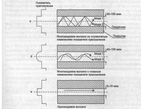Рис. 2.11. Типы оптического кабеля В многомодовых кабелях (Multi Mode Fiber, MMF) используются более широкие внутренние сердечники, которые легче изготовить технологически. В стандартах 1 определены два наиболее употребительных многомодовых кабеля: 62, 5/125 мкм и 50/125 мкм, где 62, 5 мкм или 50 мкм — это диаметр центрального проводника, а 125 мкм — диаметр внешнего проводника. В многомодовых кабелях во внутреннем проводнике одновременно существует несколько световых лучей, отражающихся от внешнего проводника под разными углами. Угол отражения луча называется модой луча. В многомодовых кабелях с плавным изменением коэффициента преломления режим распространения каждой моды имеет более сложный характер. Многомодовые кабели имеют более узкую полосу пропускания — от 500 до 800 МГц/км. Сужение полосы происходит из-за потерь световой энергии при отражениях, а также из-за интерференции лучей разных мод. В качестве источников излучения света в волоконно-оптических кабелях применяются: • светодиоды; • полупроводниковые лазеры. Для одномодовых кабелей применяются только полупроводниковые лазеры, так как при таком малом диаметре оптического волокна световой поток, создаваемый 130 Глава 2 • Основы передачи дискретных данных светодиодом, невозможно без больших потерь направить в волокно. Для многомо-довых кабелей используются более дешевые светодиодные излучатели. Для передачи информации применяется свет с длиной волны 1550 нм (1, 55 мкм), 1300 нм (1, 3 мкм) и 850 нм (0, 85 мкм). Светодиоды могут излучать свет с длиной волны 850 нм и 1300 нм. Излучатели с длиной волны 850 нм существенно дешевле, чем излучатели с длиной волны 1300 нм, но полоса пропускания кабеля для волн 850 нм уже, например 200 МГц/км вместо 500 МГц/км. Лазерные излучатели работают на длинах волн 1300 и 1550 нм. Быстродействие современных лазеров позволяет модулировать световой поток с частотами 10 ГГц и выше. Лазерные излучатели создают когерентный поток света, за счет чего потери в оптических волокнах становятся меньше, чем при использовании некогерентного потока светодиодов. Использование только нескольких длин волн для передачи информации в оптических волокнах связанно с особенностью их амплитудно-частотной характеристики. Именно для этих дискретных длин волн наблюдаются ярко выраженные максимумы передачи мощности сигнала, а для других волн затухание в волокнах существенно выше. Волоконно-оптические кабели присоединяют к оборудованию разъемами MIC, ST и SC. Волоконно-оптические кабели обладают отличными характеристиками всех типов: электромагнитными, механическими (хорошо гнутся, а в соответствующей изоляции обладают хорошей механической прочностью). Однако у них есть один серьезный недостаток — сложность соединения волокон с разъемами и между собой при необходимости наращивания длины кабеля. Сама стоимость волоконно-оптических кабелей ненамного превышает стоимость кабелей на витой паре, однако проведение монтажных работ с оптоволокном обходится намного дороже из-за трудоемкости операций и высокой стоимости применяемого монтажного оборудования. Так, присоединение оптического волокна к разъему требует проведения высокоточной обрезки волокна в плоскости строго перпендикулярной оси волокна, а также выполнения соединения путем сложной операции склеивания, а не обжатия, как это делается для витой 