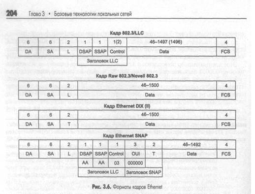 Кадр Raw 802.3/Novell 802.3 Кадр Raw 8023, называемый также кадром Novell 8023, представлен на рис. 3.6. Из рисунка видно, что это кадр подуровня MAC стандарта 802.3, но без вложенного кадра подуровня LLC. Компания Novell долгое время не использовала служебные поля кадра LLC в своей операционной системе NetWare из-за отсутствия необходимости идентифицировать тип информации, вложенной в поле данных, — там всегда находился пакет протокола IPX, долгое время бывшего единственным протоколом сетевого уровня в ОС NetWare. Теперь, когда необходимость идентификации протокола верхнего уровня появилась, компания Novell стала использовать возможность инкапсуляции в кадр подуровня MAC кадра LLC, то есть использовать стандартные кадры 802.3/LLC. Такой кадр компания обозначает теперь в своих операционных системах как кадр 802.2, хотя он является комбинацией заголовков 802.3 и 802.2. Кадр Ethernet DIX/Ethernet II Кадр Ethernet DIX, называемый также кадром Ethernet II, имеет структуру (см. рис. 3.6), совпадающую со структурой кадра Raw 802.3. Однако 2-байтовое поле Длина(Ь) кадра Raw 802.3 в кадре Ethernet DIX используется в качестве поля типа протокола. Это поле, теперь получившее название Туре (Т) или EtherType, предназначено для тех же целей, что и поля DSAP и SSAP кадра LLC — для указания типа протокола верхнего уровня, вложившего свой пакет в поле данных этого кадра. В то время как коды протоколов в полях SAP имеют длину в один байт, в поле Туре для кода протокола отводятся 2 байта. Поэтому один и тот же протокол в поле SAP и поле Туре будет кодироваться в общем случае разными числовыми _________________________________________________________ 3.3. Технология Ethernet (802.3) 205 значениями. Например, протокол IP имеет код 2048ю (0x0800) для поля EtherType и значение 6 для поля SAP. Значения кодов протоколов для поля EtherType появились раньше значений SAP, так как фирменная версия Ethernet DIX существовала до появления стандарта 802.3, и ко времени распространения оборудования 802.3 уже стали стандартами де-факто для многих аппаратных и программных продуктов. Так как структуры кадров Ethernet DIX и Raw 802.3 совпадают, то поле длины/типа часто в документации обозначают как поле L/T. Кадр Ethernet SNAP Для устранения разнобоя в кодировках типов протоколов, сообщения которых вложены в поле данных кадров Ethernet, комитетом 802.2 была проведена работа по дальнейшей стандартизации кадров Ethernet. В результате появился кадр Ethernet SNAP (SNAP — SubNetwork Access Protocol, протокол доступа к подсетям). Кадр Ethernet SNAP (см. рис. 3.6) представляет собой расширение кадра 802.3/LLC за счет введения дополнительного заголовка протокола SNAP, состоящего из двух полей: OUI и Туре. Поле Туре состоит из 2-х байт и повторяет по формату и назначению поле Туре кадра Ethernet II (то есть в нем используются те же значения кодов протоколов). Поле OUI (Organizationally Unique Identifier) определяет идентификатор организации, которая контролирует коды протоколов в поле Туре. С помощью заголовка SNAP достигнута совместимость с кодами протоколов в кадрах Ethernet II, а также создана универсальная схема кодирования протоколов. Коды протоколов для технологий 802 контролирует IEEE, которая имеет OUI, равный 000000. Если в будущем потребуются другие коды протоколов для какой-либо новой технологии, для этого достаточно указать другой идентификатор организации, назначающей эти коды, а старые значения кодов останутся в силе (в сочетании с другим идентификатором OUI). Так как SNAP представляет собой протокол, вложенный в протокол LLC, то в полях DSAP и SSA