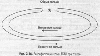 Технология FDDI (Fiber Distributed Data Interface) — оптоволоконный интерфейс распределенных данных — это первая технология локальных сетей, в которой средой передачи данных является волоконно-оптический кабель. Работы по созданию технологий и устройств для использования волоконно-оптических каналов в локальных сетях начались в 80-е годы, вскоре после начала промышленной эксплуатации подобных каналов в территориальных сетях. Проблемная группа ХЗТ9.5 института ANSI разработала в период с 1986 по 1988 гг. начальные версии стандарта FDDI, который обеспечивает передачу кадров со скоростью 100 Мбит/с по двойному волоконно-оптическому кольцу длиной до 100 км. 3.5.1. Основные характеристики технологии Технология FDDI во многом основывается на технологии Token Ring, развивая и совершенствуя ее основные идеи. Разработчики технологии FDDI ставили перед собой в качестве наиболее приоритетных следующие цели: • повысить битовую скорость передачи данных до 100 Мбит/с; • повысить отказоустойчивость сети за счет стандартных процедур восстановления ее после отказов различного рода — повреждения кабеля, некорректной работы узла, концентратора, возникновения высокого уровня помех на линии и т. п.; • максимально эффективно использовать потенциальную пропускную способность сети как для асинхронного, так и для синхронного (чувствительного к задержкам) трафиков. Сеть FDDI строится на основе двух оптоволоконных колец, которые образуют основной и резервный пути передачи данных между узлами сети. Наличие двух колец — это основной способ повышения отказоустойчивости в сети FDDI, и узлы, которые хотят воспользоваться этим повышенным потенциалом надежности, должны быть подключены к обоим кольцам. В нормальном режиме работы сети данные проходят через все узлы и все участки кабеля только первичного (Primary) кольца, этот режим назван режимом Thru -«сквозным» или «транзитным». Вторичное кольцо (Secondary) в этом режиме не используется. В случае какого-либо вида отказа, когда часть первичного кольца не может передавать данные (например, обрыв кабеля или отказ узла), первичное кольцо объединяется со вторичным (рис. 3.16), вновь образуя единое кольцо. Этот режим работы сети называется Wrap, то есть «свертывание» или «сворачивание» колец. Операция свертывания производится средствами концентраторов и/или сетевых адаптеров FDDI. Для упрощения этой процедуры данные по первичному кольцу всегда передаются в одном направлении (на диаграммах это направление изображается против часовой стрелки), а по вторичному — в обратном (изображается по часовой стрелке). Поэтому при образовании общего кольца из двух колец передатчики станций по-прежнему остаются подключенными к приемникам соседних станций, что позволяет правильно передавать и принимать информацию соседними станциями. _________________________________________________________________ 3.5. Технология FDDI 231 В стандартах FDDI много внимания отводится различным процедурам, которые позволяют определить наличие отказа в сети, а затем произвести необходимую реконфигурацию. Сеть FDDI может полностью восстанавливать свою работоспособность в случае единичных отказов ее элементов. При множественных отказах сеть распадается на несколько не связанных сетей. Технология FDDI дополняет механизмы обнаружения отказов технологии Token Ring механизмами реконфигурации пути передачи данных в сети, основанн