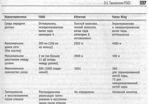 Технология FDDI разрабатывалась для применения в ответственных участках сетей — на магистральных соединениях между крупными сетями, например сетями зданий, а также для подключения к сети высокопроизводительных серверов. Поэтому главным для разработчиков было обеспечить высокую скорость передачи данных, отказоустойчивость на уровне протокола и большие расстояния между узлами сети. Все эти цели были достигнуты. В результате технология FDDI получилась качественной, но весьма дорогой. Даже появление более дешевого варианта для витой пары не намного снизило стоимость подключения одного узла к сети FDDI. Поэтому практика показала, что основной областью применения технологии FDDI стали магистрали сетей, состоящих из нескольких зданий, а также сети масштаба крупного города, то есть класса MAN. Для подключения клиентских компьютеров и даже небольших серверов технология оказалась слишком дорогой. А поскольку оборудование FDDI выпускается уже около 10 лет, значительного снижения его стоимости ожидать не приходится. В результате сетевые специалисты с начала 90-х годов стали искать пути создания сравнительно недорогих и в то же время высокоскоростных технологий, которые бы так же успешно работали на всех этажах корпоративной сети, как это делали в 80-е годы технологии Ethernet и Token Ring. Выводы • Технология FDDI первой использовала волоконно-оптический кабель в локальных сетях, а также работу на скорости 100 Мбит/с. » Существует значительная преемственность между технологиями Token Ring и FDDI: для обеих характерны кольцевая топология и маркерный метод доступа. 238 Глава 3 • Базовые технологии локальных сетей * Технология FDDI является наиболее отказоустойчивой технологией локальных сетей. При однократных отказах кабельной системы или станции сеть, за счет «сворачивания» двойного кольца в одинарное, остается вполне работоспособной. * Маркерный метод доступа FDDI работает по-разному для синхронных и асинхронных кадров (тип кадра определяет станция). Для передачи синхронного кадра станция всегда может захватить пришедший маркер на фиксированное время. Для передачи асинхронного кадра станция может захватить маркер только в том случае, когда маркер выполнил оборот по кольцу достаточно быстро, что говорит об отсутствии перегрузок кольца. Такой метод доступа, во-первых, отдает предпочтение синхронным кадрам, а во-вторых, регулирует загрузку кольца, притормаживая передачу несрочных асинхронных кадров. * В качестве физической среды технология FDDI использует волоконно-оптические кабели и UTP категории 5 (этот вариант физического уровня называется TP-PMD). » Максимальное количество станций двойного подключения в кольце — 500, максимальный диаметр двойного кольца — 100 км. Максимальные расстояния между соседними узлами для многомодового кабеля равны 2 км, для витой пары UPT категории 5 — 100 м, а для одномодового оптоволокна зависят от его качества.