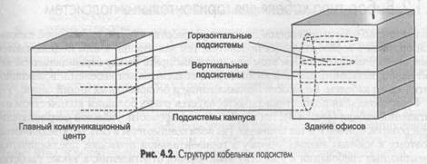 4.1. Структурированная кабельная система 265 Эта система может быть построена на базе уже существующих современных телефонных кабельных систем, в которых кабели, представляющие собой набор витых пар, прокладываются в каждом здании, разводятся между этажами, на каждом этаже используется специальный кроссовый шкаф, от которого провода в трубах и коробах подводятся к каждой комнате и разводятся по розеткам. К сожалению, в нашей стране далеко не во всех зданиях телефонные линии прокладываются витыми парами, поэтому они непригодны для создания компьютерных сетей, и кабельную систему в таком случае нужно строить заново. Типичная иерархическая структура структурированной кабельной системы (рис. 4.2) включает: • горизонтальные подсистемы (в пределах этажа); • вертикальные подсистемы (внутри здания); • подсистему кампуса (в пределах одной территории с несколькими зданиями). Горизонтальная подсистема соединяет кроссовый шкаф этажа с розетками пользователей. Подсистемы этого типа соответствуют этажам здания. Вертикальная подсистема соединяет кроссовые шкафы каждого этажа с центральной аппаратной здания. Следующим шагом иерархии является подсистема кампуса, которая соединяет несколько зданий с главной аппаратной всего кампуса. Эта часть кабельной системы обычно называется магистралью (backbone). Использование структурированной кабельной системы вместо хаотически проложенных кабелей дает предприятию много преимуществ. • Универсальность. Структурированная кабельная система при продуманной организации может стать единой средой для передачи компьютерных данных в локальной вычислительной сети, организации локальной телефонной сети, передачи видеоинформации и даже передачи сигналов от датчиков пожарной безопасности или охранных систем. Это позволяет автоматизировать многие процессы контроля, мониторинга и управления хозяйственными службами и системами жизнеобеспечения предприятия. • Увеличение срока службы. Срок морального старения хорошо структурированной кабельной системы может составлять 10-15 лет.