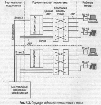 4.1.3. Выбор типа кабеля для вертикальных подсистем Кабель вертикальной (или магистральной) подсистемы, которая соединяет этажи здания, должен передавать данные на большие расстояния и с большей скоростью по сравнению с кабелем горизонтальной подсистемы. В прошлом основным видом кабеля для вертикальных подсистем был коаксиал. Теперь для этой цели все чаще используется оптоволоконный кабель. Для вертикальной подсистемы выбор кабеля в настоящее время ограничивается тремя вариантами. • Оптоволокно — отличные характеристики пропускной способности, расстояния и защиты данных; устойчивость к электромагнитным помехам; может передавать голос, видеоизображение и данные. Но сравнительно дорого, сложно выполнять ответвления. • Толстый коаксиал — хорошие характеристики пропускной способности, расстояния и защиты данных; может передавать данные. Но с ним сложно работать, хотя специалистов, имеющих подобный опыт работы, достаточно много. • Широкополосный кабель, используемый в кабельном телевидении, — хорошие показатели пропускной способности и расстояния; может передавать голос, видео и данные. Но очень сложно работать и требуются большие затраты во время эксплуатации. 270 Глава 4 • Построение локальных сетей по стандартам физического и канального уровней Применение волоконно-оптического кабеля в вертикальной подсистеме имеет ряд преимуществ. Он передает данные на значительно большие расстояния без необходимости регенерации сигнала. Он имеет сердечник меньшего диаметра, поэтому может быть проложен в более узких местах. Так как передаваемые по нему сигналы являются световыми, а не электрическими, оптоволоконный кабель не чувствителен к электромагнитным и радиочастотным помехам, в отличие от медного коаксиального кабеля. Это делает оптоволоконный кабель идеальной средой передачи данных для промышленных сетей. Оптоволоконному кабелю не страшна молния, поэтому он хорош для внешней прокладки. Он обеспечивает более высокую степень защиты от несанкционированного доступа, так как ответвление гораздо легче обнаружить, чем в случае медного кабеля (при ответвлении резко уменьшается интенсивность света). Оптоволоконный кабель имеет и недостатки. Он дороже чем медный кабель, дороже обходится и его прокладка. Оптоволоконный кабель менее прочный, чем коаксиальный. Инструменты, применяемые при прокладке и тестировании оптоволоконного кабеля, имеют высокую стоимость и сложны в работе. Присоединение коннекторов к оптоволоконному кабелю требует большого искусства и времени, а следовательно, и денег. Для уменьшения стоимости построения межэтажной магистрали на оптоволокне некоторые компании, например AMP, предлагают кабельную систему с одним коммутационным центром. Обычно, коммутационный центр есть на каждом этаже, а в здании имеется общий коммутационный центр (см. рис. 4.3.), соединяющий между собой коммутационные центры этажей. При такой традиционной схеме и использовании волоконно-оптического кабеля между этажами требуется выполнять достаточное большое число оптоволоконных соединений в коммутационных центрах этажей. Если же коммутационный центр в здании один, то все оптические кабели расходятся из единого кроссового шкафа прямо к разъемам конечного оборудования — коммутаторов, концентраторов или сетевых адаптеров с