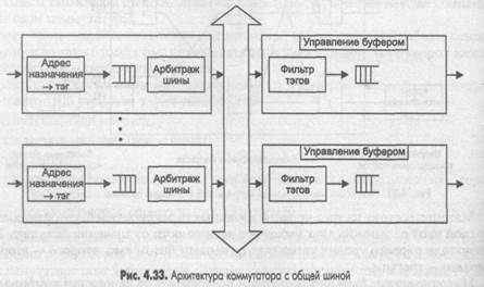Матрица состоит из трех уровней двоичных переключателей, которые соединяют свой вход с одним из двух выходов в зависимости от значения бита тэга. Переключатели первого уровня управляются первым битом тэга, второго — вторым, а третьего — третьим. Матрица может быть реализована и по-другому, на основании комбинационных схем другого типа, но ее особенностью все равно остается технология коммутации физических каналов. Известным недостатком этой технологии является отсутствие буферизации данных внутри коммутационной матрицы — если составной канал невозможно построить из-за занятости выходного порта или промежуточного коммутационного элемента, то данные должны накапливаться в их источнике, в данном случае — во входном блоке порта, принявшего кадр. Основные достоинства таких матриц — высокая скорость коммутации и регулярная структура, которую удобно реализовывать в интегральных микросхемах. Зато после pea- 316 Глава4 • Построение локальных сетей по стандартам физического и канального уровней лизации матрицы NxN в составе БИС проявляется еще один ее недостаток — сложность наращивания числа коммутируемых портов. Коммутаторы с общей шиной В коммутаторах с общей шиной процессоры портов связывают высокоскоростной шиной, используемой в режиме разделения времени. Пример такой архитектуры приведен на рис. 4.33. Чтобы шина не блокировала работу коммутатора, ее производительность должна равняться по крайней мере сумме производительности всех портов коммутатора. Для модульных коммутаторов некоторые сочетания модулей с низкоскоростными портами могут приводить к неблокирующей работе, а установка модулей с высокоскоростными портами может приводить к тому, что блокирующим элементом станет, например, общая шина. Кадр должен передаваться по шине небольшими частями, по нескольку байт, чтобы передача кадров между несколькими портами происходила в псевдопараллельном режиме, не внося задержек в передачу кадра в целом. Размер такой ячейки данных определяется производителем коммутатора. Некоторые производители, например LANNET или Centillion, выбрали в качестве порции данных, переносимых за одну операцию по шине, ячейку ATM с ее полем данных в 48 байт. Такой подход облегчает трансляцию протоколов локальных сетей в протокол ATM, если коммутатор поддерживает эти технологии.