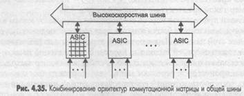 Память должна быть достаточно быстродействующей для поддержания скорости переписи данных между N портами коммутатора. Применение общей буферной памяти, гибко распределяемой менеджером между отдельными портами, снижает требования к размеру буферной памяти процессора порта. Комбинированные коммутаторы У каждой из описанных архитектур есть свои преимущества и недостатки, поэтому часто в сложных коммутаторах эти архитектуры применяются в комбинации друг с другом. Пример такого комбинирования приведен на рис. 4.35. Коммутатор состоит из модулей с фиксированным количеством портов (2-12), выполненных на основе специализированной БИС, реализующей архитектуру коммутационной матрицы. Если порты, между которыми нужно передать кадр данных, принадлежат одному модулю, то передача кадра осуществляется процессорами модуля на основе имеющейся в модуле коммутационной матрицы. Если же порты принадлежат разным модулям, то процессоры общаются по общей шине. При такой архитектуре передача кадров внутри модуля будет происходить быстрее, чем при межмодульной передаче, так как коммутационная матрица — наиболее быстрый, хотя и наименее масштабируемый способ взаимодействия портов. Скорость 318 Глава4 • Построение локальных сетей по стандартам физического и канального уровней внутренней шины коммутаторов может достигать нескольких Гбит/с, а у наиболее мощных моделей — до 20-30 Гбит/с.