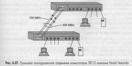 Компания Cisco предложила другой подход к организации стека. Ее коммутатор Catalyst 3000 также имеет специальный скоростной интерфейс 280 Мбит/с для организации стека, но с его помощью коммутаторы соединяются не друг с другом, а с отдельным устройством, содержащим коммутационную матрицу 8x8, организующую более высокопроизводительный обмен между любыми парами коммутаторов. Существуют коммутаторы, которые позволяют объединить два коммутатора полнодуплексным каналом более чем по одной паре портов. Например, коммутаторы модели 28115 компании Nortel Networks имеют по два порта Fast Ethernet, с помощью которых можно соединять коммутаторы, образуя полнодуплексный канал с производительностью 400 Мбит/с (рис. 4.37).