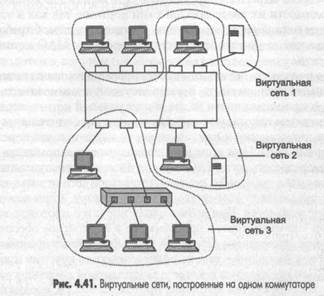 Изменение состава сегментов (переход пользователя в другую сеть, дробление крупных сегментов) при таком подходе подразумевает физическую перекоммутацию разъемов на передних панелях повторителей или в кроссовых панелях, что не очень удобно в больших сетях — много физической работы, к тому же высока вероятность ошибки. Поэтому для устранения необходимости физической перекоммутации узлов стали применять многосегментные концентраторы, рассмотренные в разделе 4.2.2. Возникла возможность программировать состав разделяемого сегмента без физической перекоммутации. 334 Глава 4 • Построение локальных сетей по стандартам физического и канального уровней Однако решение задачи изменения состава сегментов с помощью концентраторов накладывает большие ограничения на структуру сети — количество сегментов такого повторителя обычно невелико, поэтому выделить каждому узлу свой сегмент, как это можно сделать с помощью коммутатора, нереально. Кроме того, при таком подходе вся работа по передаче данных между сегментами ложится на маршрутизаторы, а коммутаторы со своей высокой производительностью остаются не у дел. Поэтому сети, построенные на основе повторителей с конфигурационной коммутацией, по-прежнему основаны на разделении среды передачи данных между большим количеством узлов, и, следовательно, обладают гораздо меньшей производительностью по сравнению с сетями, построенными на основе коммутаторов. При использовании технологии виртуальных сетей в коммутаторах одновременно решаются две задачи: • повышение производительности в каждой из виртуальных сетей, так как коммутатор передает кадры в такой сети только узлу назначения; • изоляция сетей друг от друга для управления правами доступа пользователей и создания защитных барьеров на пути широковещательных штормов. Для связи виртуальных сетей в общую сеть требуется привлечение сетевого уровня. Он может быть реализован в отдельном маршрутизаторе, а может работать и в составе программного обеспечения коммутатора, который тогда становится комбинированным устройством — так называемым коммутатором 3-го уровня. Коммутаторы 3-го уровня рассматриваются в главе 5. Технология образования и работы виртуальных сетей с помощью коммутаторов долгое время не стандартизировалась, хотя и была реализована в очень широком спектре моделей коммутаторов разных производителей. Такое положение изменилось после принятия в 1998 году стандарта IEEE 802.1Q, который определяет базовые правила построения виртуальных локальных сетей, не зависящие от протокола канального уровня, который поддерживает коммутатор. В виду долгого отсутствия стандарта на VLAN каждый крупный производитель коммутаторов разработал свою технологию виртуальных сетей, которая, как правило, была несовместима с технологиями других производителей. Поэтому, несмотря на появление стандарта, можно не так уж редко встретиться с ситуацией, когда виртуальные сети, созданные на коммутаторах одного производителя, не распознаются и, соответственно, не поддерживаются коммутаторами другого производителя. При создании виртуальных сетей на основе одного коммутатора обычно используется механизм группирования в сети портов коммутатора (рис. 4.41). При этом каждый порт приписывается той или иной виртуальной сети. Кадр, пришедший от порта, пр