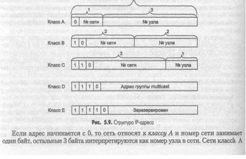 5.2. Адресация в IP-сетях 369 имеют номера в диапазоне от 1 до 126. (Номер 0 не используется, а номер 127 зарезервирован для специальных целей, о чем будет сказано ниже.) Сетей класса А немного, зато количество узлов в них может достигать 224, то есть 16 777 216 узлов. Если первые два бита адреса равны 10, то сеть относится к классу В. В сетях класса В под номер сети и под номер узла отводится по 16 бит, то есть по 2 байта. Таким образом, сеть класса В является сетью средних размеров с максимальным числом узлов 216, что составляет 65 536 узлов. Если адрес начинается с последовательности ПО, то это сеть класса С. В этом случае под номер сети отводится 24 бита, а под номер узла — 8 бит. Сети этого класса наиболее распространены, число узлов в них ограничено 28, то есть 256 узлами. Если адрес начинается с последовательности 1110, то он является адресом класса D и обозначает особый, групповой адрес — multicast. Если в пакете в качестве адреса назначения указан адрес класса D, то такой пакет должны получить все узлы, которым присвоен данный адрес. Если адрес начинается с последовательности 11110, то это значит, что данный адрес относится к классу Е. Адреса этого класса зарезервированы для будущих применений. В табл. 5.4 приведены диапазоны номеров сетей и максимальное число узлов, соответствующих каждому классу сетей.