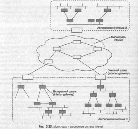 5.4.1. Внутренние и внешние протоколы маршрутизации Internet Большинство протоколов маршрутизации, применяемых в современных сетях с коммутацией пакетов, ведут свое происхождение от сети Internet и ее предшественницы — сети ARPANET. Для того чтобы понять их назначение и особенности, полезно сначала познакомиться со структурой сети Internet, которая наложила отпечаток на терминологию и типы протоколов. Internet изначально строилась как сеть, объединяющая большое количество существующих систем. С самого начала в ее структуре выделяли магистральную сеть (care backbone network), а сети, присоединенные к магистрали, рассматривались как автономные системы (autonomous systems, AS). Магистральная сеть и каждая из автономных систем имели свое собственное административное управление и собственные протоколы маршрутизации. Необходимо подчеркнуть, что автономная система и домен имен Internet — это разные понятия, которые служат разным целям. Автономная система объединяет сети, в которых под общим административным руководством одной организации осуществляется маршрутизация, а домен объединяет компьютеры (возможно, принадлежащие разным сетям), в которых под общим административным руководством одной организации осуществляется назначение уникальных символьных имен. Естественно, области действия автономной системы и домена имен могут в частном случае совпадать, если одна организация выполняет обе указанные функции. Общая схема архитектуры сети Internet показана на рис. 5.25. Далее маршрутизаторы мы будем называть шлюзами, чтобы оставаться в русле традиционной терминологии Internet. Шлюзы, которые используются для образования сетей и подсетей внутри автономной системы, называются внутренними шлюзами (interiorgateways), а шлюзы, с помощью которых автономные системы присоединяются к магистрали сети, называются внешними шлюзами (exterior gateways). Магистраль сети также является автономной системой. Все автономные системы имеют уникальный 16-разрядный номер, который выделяется организацией, учредившей новую автономную систему, InterNIC. Соответственно протоколы маршрутизации внутри автономных систем называются протоколами внутренних шлюзов (interior gateway protocol, IGP), а протоколы, определяющие обмен маршрутной информацией между внешними шлюзами и шлюзами магистральной сети — протоколами внешних шлюзов (exterior gateway protocol, EGP). Внутри магистральной сети также допустим любой собственный внутренний протокол IGP. Смысл разделения всей сети Internet на автономные системы — в ее многоуровневом модульном представлении, что необходимо для любой крупной системы, способной к расширению в больших масштабах. Изменение протоколов маршрутизации внутри какой-либо автономной системы никак не должно влиять на работу остальных автономных систем. Кроме того, деление Internet на автономные 418 Глава 5 • Сетевой уровень как средство построения больших сетей системы должно способствовать агрегированию информации в магистральных и внешних шлюзах. Внутренние шлюзы могут использовать для внутренней маршрутизации достаточно подробные графы связей между собой, чтобы выбрать наиболее рациональный маршрут. Однако если информация такой степени детализации будет храниться во всех маршрутизаторах сети, то топологические базы данных так разрастутся, что потребуют наличия памяти гигантских размеров, а время принятия решений о маршрут