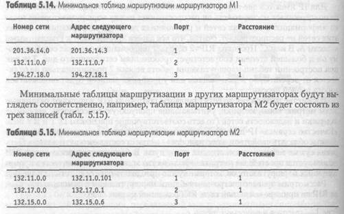 В исходном состоянии в каждом маршрутизаторе программным обеспечением стека TCP/IP автоматически создается минимальная таблица маршрутизации, в которой учитываются только непосредственно подсоединенные сети. На рисунке адреса портов маршрутизаторов в отличие от адресов сетей помещены в овалы. Таблица 5.14 позволяет оценить примерный вид минимальной таблицы маршрутизации маршрутизатора Ml.