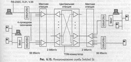 Выделенные линии представляют собой наиболее надежное средство соединения локальных сетей через глобальные каналы связи, так как вся пропускная способность такой линии всегда находится в распоряжении взаимодействующих сетей. Однако это и наиболее дорогой вид глобальных связей — при наличии N удаленных локальных сетей, которые интенсивно обмениваются данными друг с другом, нужно иметь Nx(N-l)/2 выделенных линий. Для снижения стоимости глобального транспорта применяют динамически коммутируемые каналы, стоимость которых разделяется между многими абонентами этих каналов. Наиболее дешевыми оказываются услуги телефонных сетей, так как их коммутаторы оплачиваются большим количеством абонентов, пользующихся телефонными услугами, а не только абонентами, которые объединяют свои локальные сети. Телефонные сети делятся на аналоговые и цифровые в зависимости от способа мультиплексирования абонентских и магистральных каналов. Более точно, цифровыми называются сети, в которых на абонентских окончаниях информация представлена в цифровом виде и в которых используются цифровые методы мультиплексирования и коммутации, а аналоговыми — сети, которые принимают данные от абонентов аналоговой формы, то есть от классических аналоговых телефонных 6.3. Глобальные связи на основе сетей с коммутацией каналов 501 аппаратов, а мультиплексирование и коммутацию осуществляют как аналоговыми методами, так и цифровыми. В последние годы происходил достаточно интенсивный процесс замены коммутаторов телефонных сетей на цифровые коммутаторы, которые работают на основе технологии TDM. Однако такая сеть по-прежнему останется аналоговой телефонной сетью, даже если все коммутаторы будут работать по технологии TDM, обрабатывая данные в цифровой форме, если абонентские окончания у нее останутся аналоговыми, а аналого-цифровое преобразование выполняется на ближней к абоненту АТС сети. Новая технология модемов V.90 смогла использовать факт существования большого количества сетей, в которых основная часть коммутаторов являются цифровыми. К телефонным сетям с цифровыми абонентскими окончаниями относятся так называемые службы Switched 56 (коммутируемые каналы 56 Кбит/с) и цифровые сети с интегральными услугами ISDN (Intergrated Services Digital Network). Службы Switched 56 появились в ряде западных стран в результате предоставления конечным абонентам цифрового окончания, совместимого со стандартами линий Т1. Эта технология не стала международным стандартом, и сегодня она вытеснена технологией ISDN, которая такой статус имеет. Сети ISDN рассчитаны не только на передачу голоса, но и компьютерных данных, в том числе и с помощью коммутации пакетов, за счет чего они получили название сетей с интегральными услугами. Однако основным режимом работы сетей ISDN остается режим коммутации каналов, а служба коммутации пакетов обладает слишком низкой по современным меркам скоростью — обычно до 9600 бит/с. Поэтому технология ISDN будет рассмотрена в данном разделе, посвященном сетям с коммутацией каналов. Новое поколение сетей с интеграцией услуг названное B-ISDN (от broadband — широкополосные), основано уже целиком на технике коммутации пакетов (точнее, ячеек технологии ATM), поэтому эта технология будет рассмотрена в разделе, посвященном сетям с коммутацией пакетов. Пока географическая распространенность а