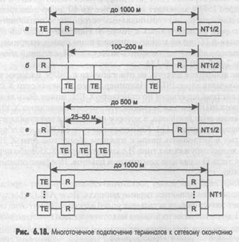 Устройства функциональной группы NT1 (Network Termination 1) образуют цифровое абонентское окончание (Digital Suscriber Line, DSL) на кабеле, соединяющем пользовательское оборудование с сетью ISDN. Фактически NT1 представляет собой устройство типа CSU, которое работает на физическом уровне и образует дуплексный канал с соответствующим устройством CSU, установленном на территории оператора сети ISDN. Справочная точка U соответствует точке подключения устройства NT1 к сети. Устройство NT1 может принадлежать оператору сети (хот* всегда устанавливается в помещении пользователя), а может принадлежать и пользователю. В Европе принято считать устройство NT1 частью оборудования сети, поэтому пользовательское оборудование (например, маршрутизатор с интерфейсо\ ISDN) выпускается без встроенного устройства NT1. В Северной Америке принятс считать устройство NT1 принадлежностью пользовательского оборудования, по этому для этого применения оборудование часто выпускается со встроенным уст ройством NT1. Если пользователь подключен через интерфейс BRI, то цифровое абонентско< окончание выполнено по 2-проводной схеме (как и обычное окончание аналогово! телефонной сети). Для организации дуплексного режима используется технологии одновременной выдачи передатчиками потенциального кода 2В1Q с эхо-подавле 512 Глава 6 • Глобальные сети нием и вычитанием своего сигнала из суммарного. Максимальная длина абонентского окончания в этом случае составляет 5, 5 км. При использовании интерфейса PRI цифровое абонентское окончание выполняется по схеме канала Т1 или Е1, то есть является 4-проводным с максимальной длиной около 1800 м. Устройства функциональной группы NT2 (Network Termination 2) представляют собой устройства канального или сетевого уровня, которые выполняют функции концентрации пользовательских интерфейсов и их мультиплексирование. Например, к этому типу оборудования относятся: офисная АТС (РВХ), коммутирующая несколько интерфейсов BRI, маршрутизатор, работающий в режиме коммутации пакетов (например, по каналу D), простой мультиплексор TDM, который мультиплексирует несколько низкоскоростных каналов в один канал типа В. Точка подключения оборудования типа NT2 к устройству NT1 называется справочной точкой типа Т. Наличие этого типа оборудования не является обязательным в отличие orNTl. Устройства функциональной группы ТЕ1 (Terminal Equipment 1) относятся к устройствам, которые поддерживают интерфейс пользователя BRI или PRI. Справочная точка S соответствует точке подключения отдельного терминального оборудования, поддерживающего один из интерфейсов пользователя ISDN. Таким оборудованием может быть цифровой телефон или факс-аппарат. Так как оборудование типа NT2 может отсутствовать, то справочные точки S и Т объединяются и обозначаются как S/T. Устройства функциональной группы ТЕ2 (Terminal Equipment 2) представляют собой устройства, которые не поддерживают интерфейс BRI или PRI. Таким устройством может быть компьютер, маршрутизатор с последовательными интерфейсами, не относящимися к ISDN, например RS-232C, Х.21 или V.35. Для подключения такого устройства к сети ISDN необходимо использовать терминальный адаптер (Terminal Adaptor, ТА). Для компьютеров терминальные адаптеры выпускаются в формате сетевых адаптеров — как встраиваемая карта. Физически интерфейс в точке S/T представляет собой 4-проводную линию. Так как кабель между устройствам