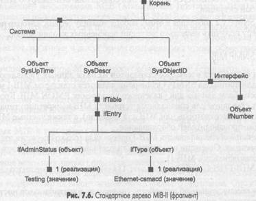 Как и в любых сложных системах, пространство имен объектов ISO имеет древовидную иерархическую структуру, причем на рис. 7.7 показана только его верхняя часть. От корня этого дерева отходят три ветви, соответствующие стандартам, 7.2. Стандарты систем управления 603 контролируемым ISO, ITU и совместно ISO-ITU. В свою очередь, организация ISO создала ветвь для стандартов, создаваемых национальными и международными организациями (ветвь org). Стандарты Internet создавались под эгидой Министерства обороны США (Departament of Defence, DoD), поэтому стандарты MIB попали в поддерево dod-internet, а далее, естественно, в группу стандартов управления сетью — ветвь mgmt Объекты любых стандартов, создаваемых под эгидой ISO, однозначно идентифицируются составными символьными именами, начинающимися от корня этого дерева. В сообщениях протоколов символьные имена не используются, а применяются однозначно соответствующие им составные числовые имена. Каждая ветвь дерева имен объектов нумеруется в дереве целыми числами слева направо, начиная с единицы, и эти числа и заменяют символьные имена. Поэтому полное символьное имя объекта MIB имеет вид: iso.org.dod.internet.mgmt.mib, а полное числовое имя: 1.3.6.1.2.1. Группа объектов private (4) зарезервирована за стандартами, создаваемыми частными компаниями, например Cisco, Hewlett-Packard и т. п. Это же дерево регистрации используется для именования классов объектов CMIP и TMN. Соответственно, каждая группа объектов MIB-I и MIB-II также имеет кроме кратких символьных имен, приведенных выше, полные символьные имена и соответствующие им числовые имена. Например, краткое символьное имя группы System имеет полную форму iso.org.dod.internet.mgmt.mib.system, а ее соответствующее числовое имя — 1.3.6.1.2.1. Часть дерева имен ISO, включающая группы объектов MIB, показана на рис. 7.8.